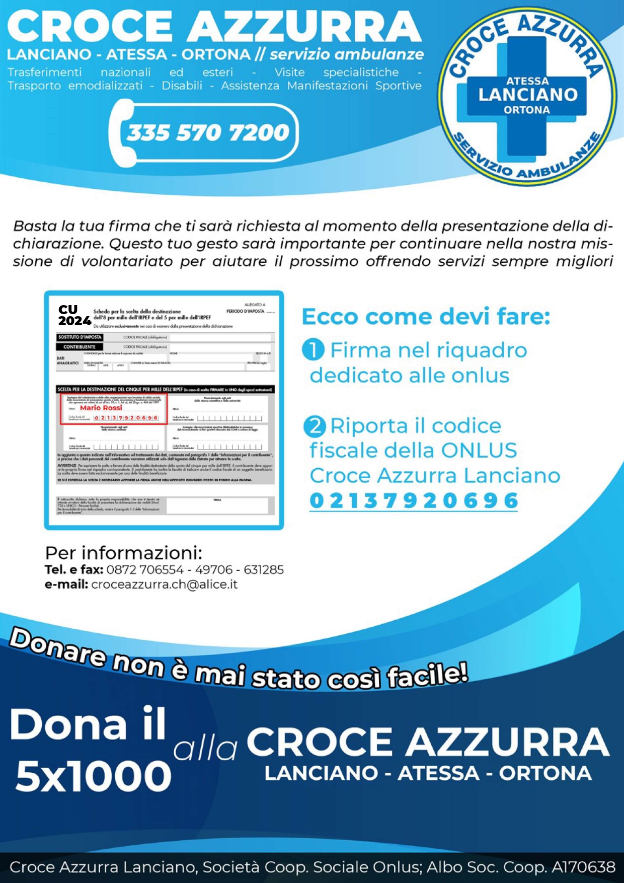 Sottoscrivere il 5×1000 a favore della Croce Azzurra Lanciano è un gesto semplice e non comporta alcuna spesa. Puoi scegliere di donare il 5×1000 alla Croce Azzurra Lanciano con la dichiarazione dei redditi, come lavoratore dipendente o pensionato (presentando il modello 730), come libero professionista o persona che ha delle partecipazioni in società (modello Unico).