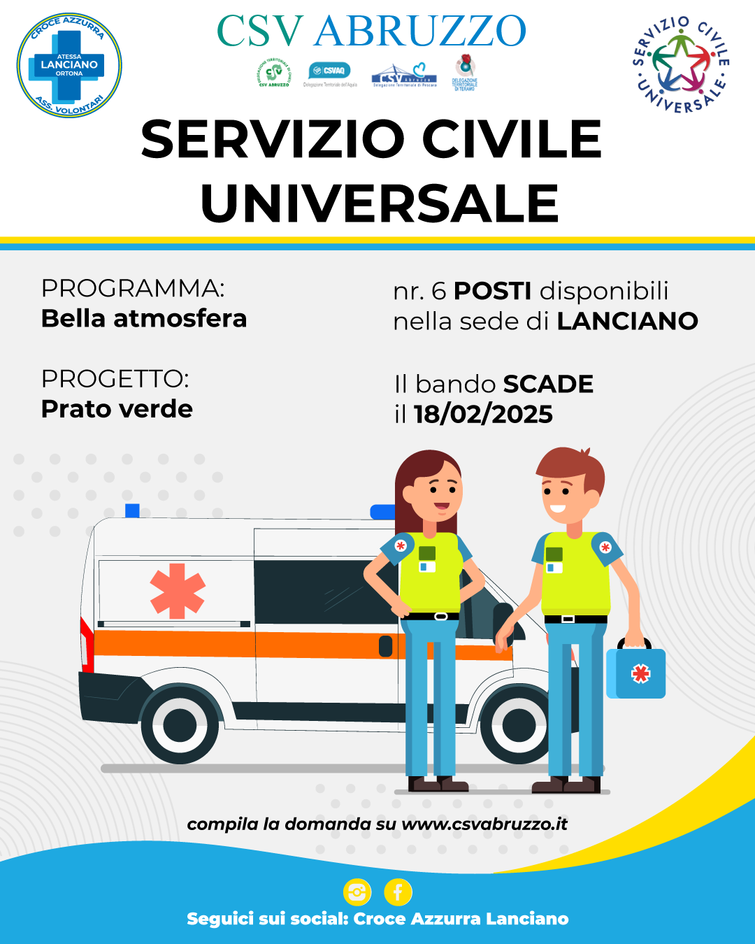 Sei alla ricerca di un’opportunità unica per crescere, imparare e contribuire attivamente alla tua comunità? Scegli la Croce Azzurra di Lanciano all’interno del CSV Abruzzo, ente accreditato per il Servizio Civile Universale.